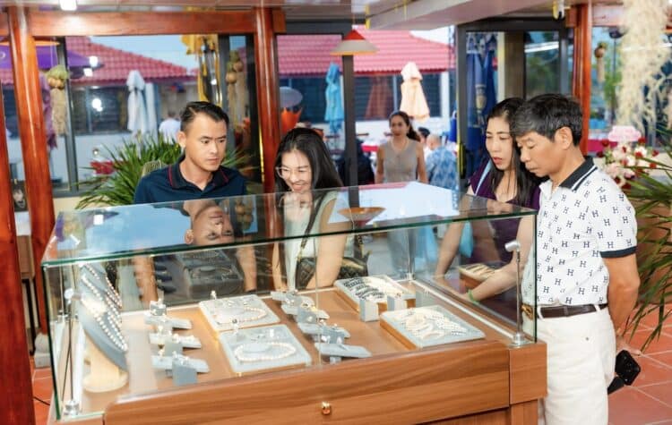 Nhiều du khách thích thú khi được “mãn nhãn” các sản phẩm ngọc trai do nghệ nhân kim hoàn quốc gia Hồ Thị Thanh Hương chế tác