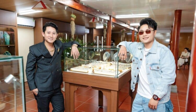 Ca sĩ Hồ Gia Hùng và ca sĩ Quân Juno thích thú khi được thưởng lãm các chế tác của nghệ nhân Hồ Thị Thanh Hương