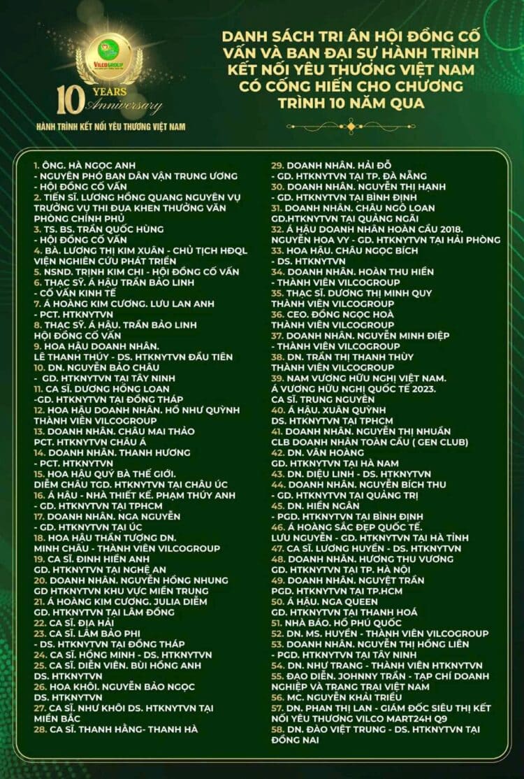 Được biết, ban tổ chức Hành Trình Kết Nối Yêu Thương Việt Nam trong 10 năm qua đã tài trợ và kết nối các mạnh thường quân trong và ngoài nước, các tổ chức xã hội đến tận nơi. Cấp phát thuốc, tặng bảo hiểm phòng chống tai nạn thương tích, đào tạo việc làm cho những người khuyết tật, tặng xe lăn, xe đạp, máy tính, dụng cụ học tập cho trẻ em nghèo vượt khó học giỏi, hỗ trợ điều trị cho các cháu nghèo bị ung thư, tim bẩm sinh, hở hàm ếch, nhà tình thương cho các bà mẹ Việt Nam anh hùng, hỗ trợ cho các hoàn cảnh bị chất độc dioxin, bảo trợ cho các gia đình chính sách không nơi nương tựa, xây trường học, trao học bổng cho trẻ em nghèo vượt khó học giỏi học hết đại học, tài trợ siêu thị không đồng, giếng nước sạch, nhà nội trú, dạy kỹ năng sống, đào tạo công ăn việc làm dành cho sinh viên mới ra trường nói riêng và cho xã hội nói chung, thông qua dự án, an sinh xã hội khởi nghiệp quốc gia vốn không đồng do Vilcogroup triển khai, hỗ trợ những hoàn cảnh khó khăn trong lúc dịch Covid-19, các nơi bị thiên tai, bão lũ, tổng số tiền và hiện vật trên 550 tỷ đồng thông qua nhiều tổ chức xã hội và các cá nhân.