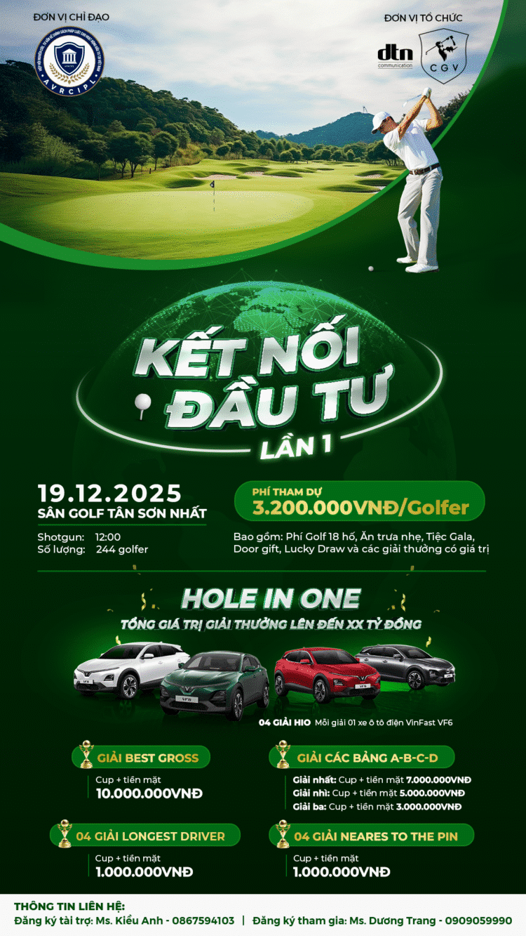 Đồng thời, tạo sân chơi hữu ích giữa các doanh nghiệp và các hội viên Hiệp hội có cơ hội giao lưu rèn luyện thể thao, thúc đẩy tinh thần đoàn kết, hữu nghị, hợp tác lẫn nhau, ngày 19/12/2025 tới đây, giải Golf “Kết nối đầu tư” lần thứ I – năm 2025 sẽ được khởi tranh tại Sân Golf Tân Sơn Nhất, TP. Hồ Chí Minh. Theo đó, Giải Golf “Kết nối đầu tư” sẽ được diễn ra thường niên do Hiệp hội Nghiên cứu, Tư vấn về Chính sách, pháp luật cho hoạt động đầu tư tại Việt Nam (tên viết tắt AVRCIPL).