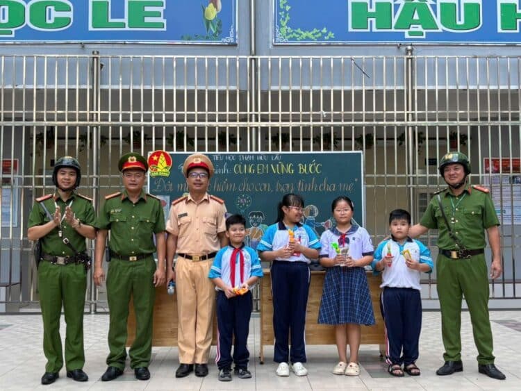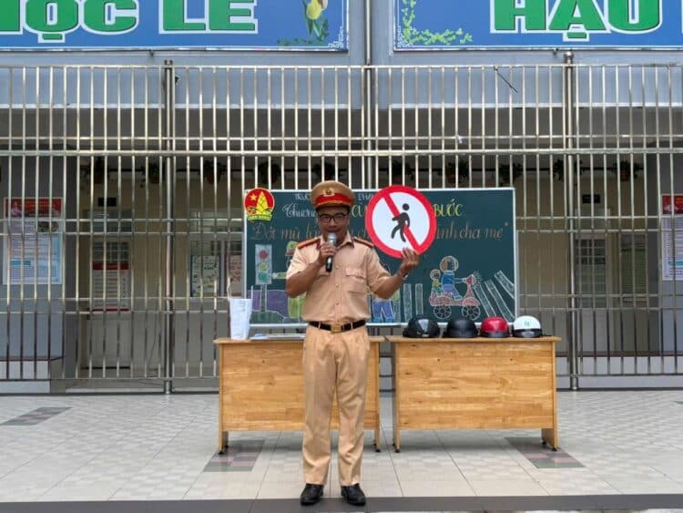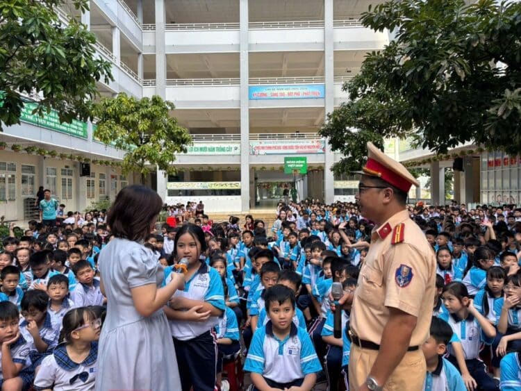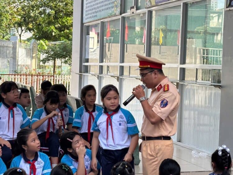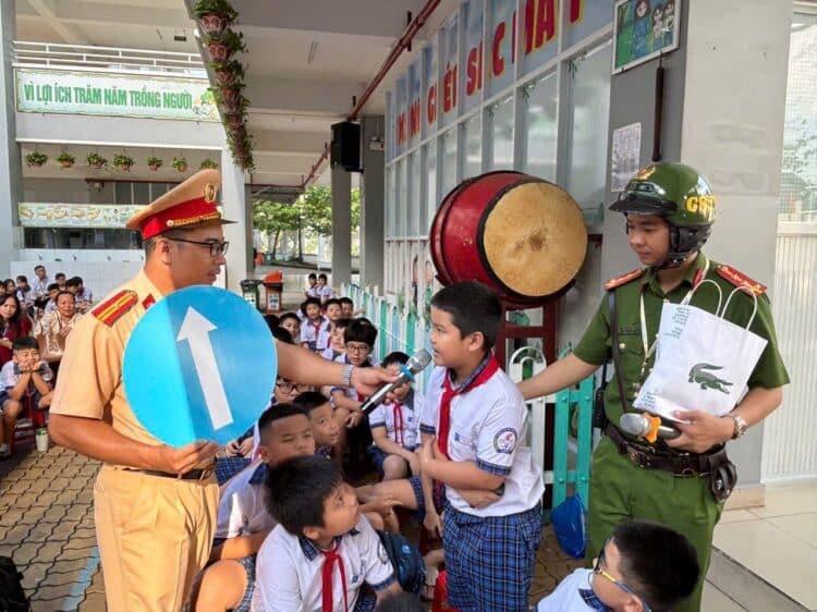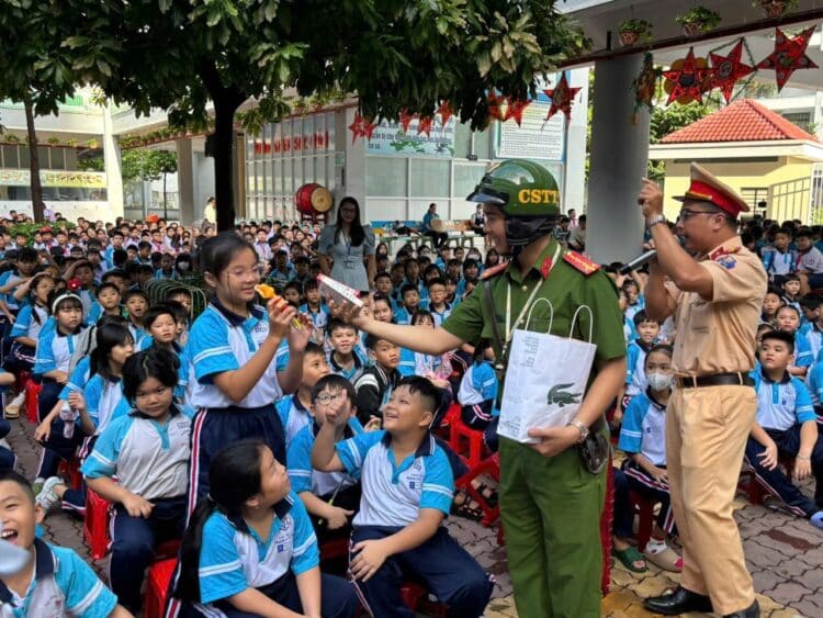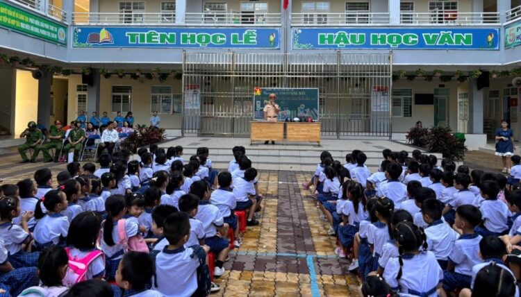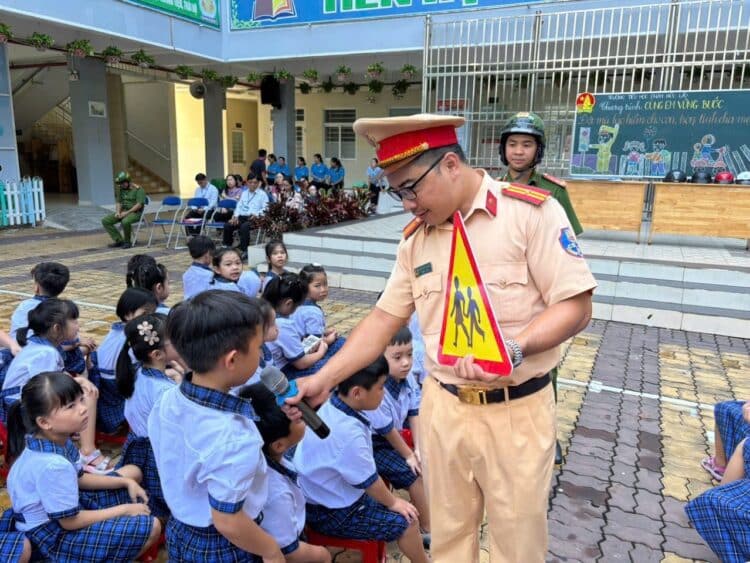 Trạm CSGT Đa Phước phối hợp công an phường Tân Mỹ (sau sáp nhập) tuyên truyền an toàn giao thông học đường tại trường tiểu học Phạm Hữu Lầu