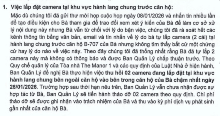 Trong bối cảnh an ninh bị buông lỏng kéo dài, việc Ban Quản lý gửi văn bản gây áp lực, đe dọa tháo dỡ camera của cư dân, thậm chí nêu khả năng tự ý tháo và tính chi phí, đã khiến cư dân nơi đâykhông khỏi băn khoăn. Vì sao thay vì tập trung khắc phục các lỗ hổng an ninh, người ta lại tìm cách loại bỏ công cụ giúp phát hiện rủi ro?